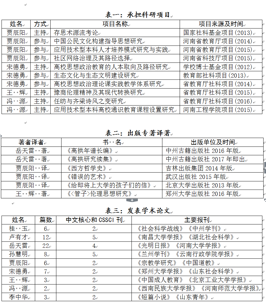 中心负责人岳天雷,教授,省教育厅学术技术带头人,主要从事儒家哲学和中原文化研究。撰有《高拱实学实政论纲》、《高拱研究文集》、《高拱研究续集》和《高拱年谱长编》,合校《高拱全集》和《问辨录》。在《中国哲学史》、《孔子研究》、《光明日报》、《香港中文大学中国文化研究所学报》、《中国图书评论》、《中州学刊》、《河南大学学报》等海内外刊物上发表论文百余篇。