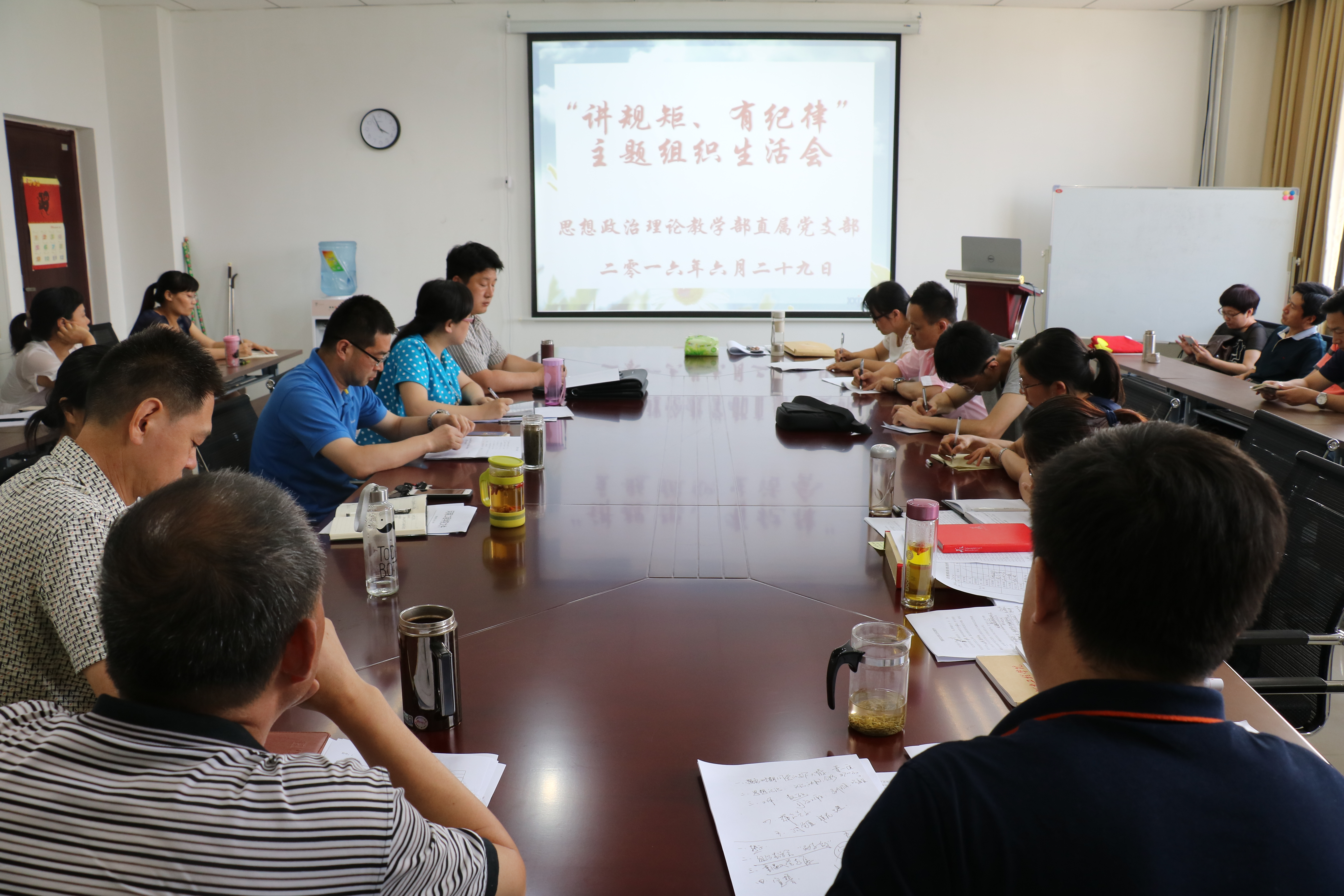 6月29日下午,28365-365体育投注在综合楼722会议室召开“讲规矩、有纪律”主题组织生活会。会议由直属党支部书记曹宇旗主持,思政部党员教师参加会议。